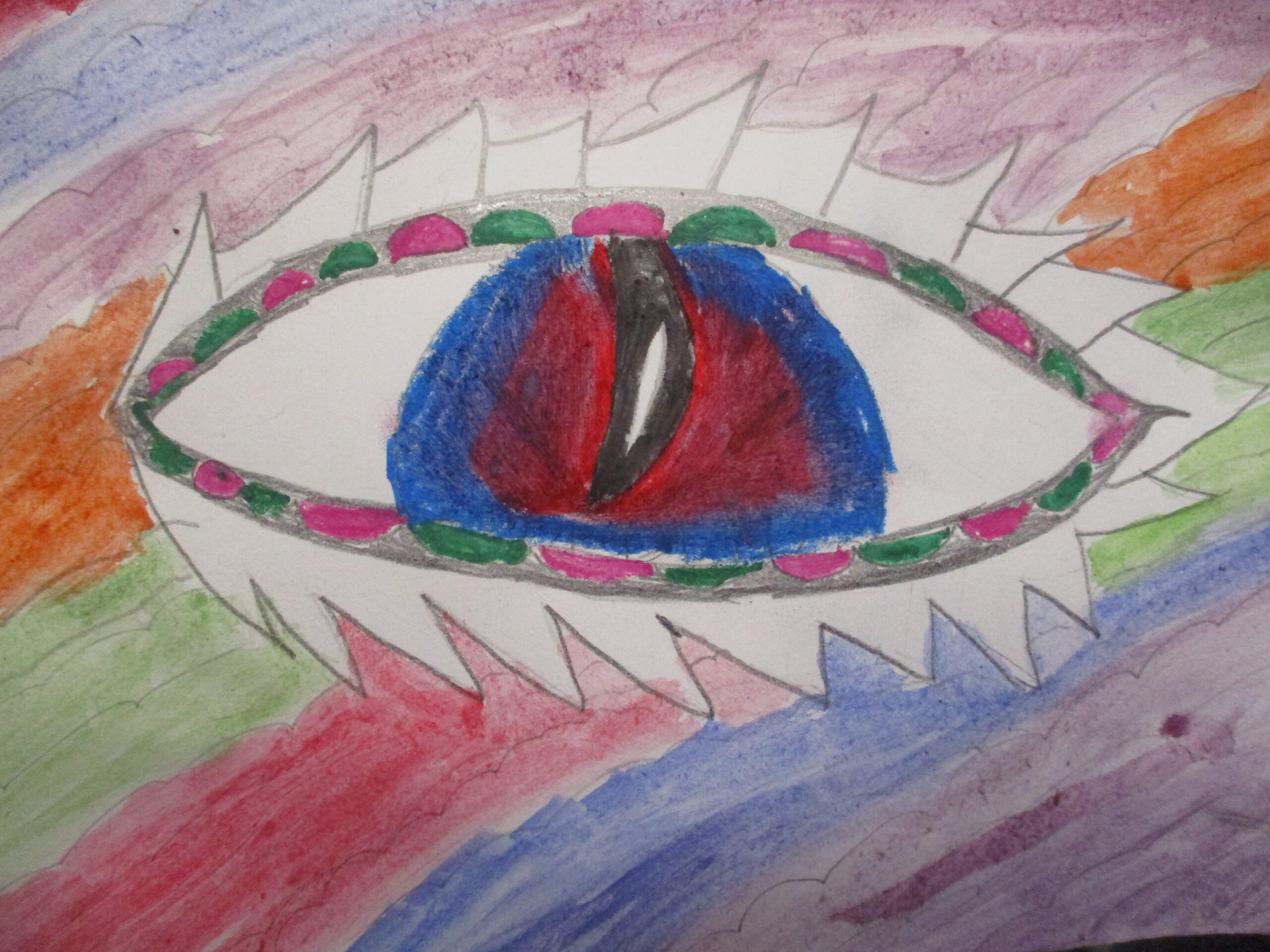 In Year 5, we have been developing our ability to use different artistic media (watercolour paint or pencils, sketching pencils, colouring pencils, oil and chalk pastels). We initially sketched the outline of a dragon eye, before deciding on the scaling around the eye. The final aspect was to consider a colour scheme with either contrast or blending.